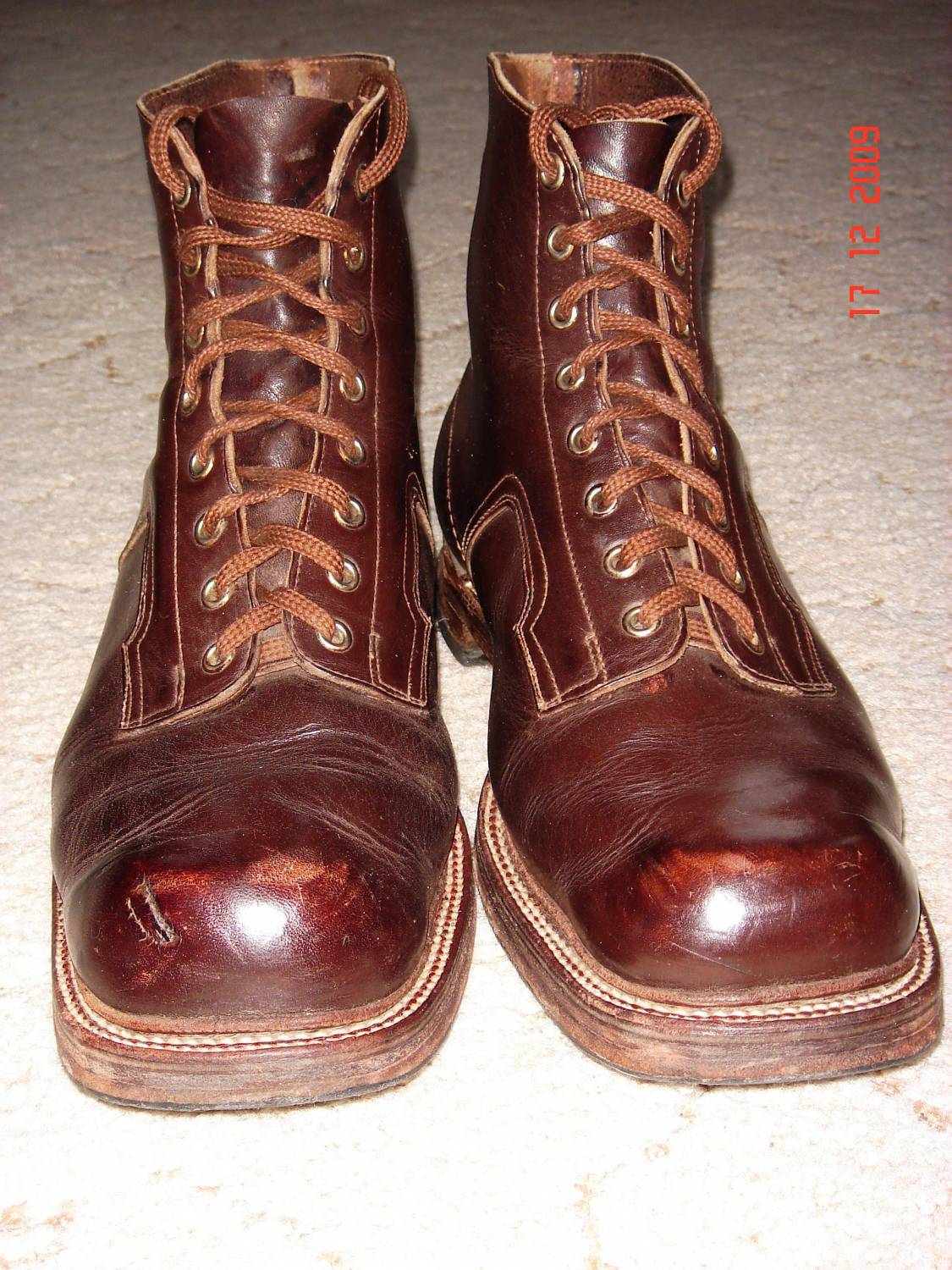 Вот такие сейчас ношу ботинки. Покупал новые в комиссионном магазине 600р. в 2002 году 45 размер. На подошве стоял штамп от производителя, но он стерся, а я не записал, так что где и когда производились не известно. С боку, в коже выдавлена корона и цифры 1945. Кожаная подошва пробита деревянными шпильками. Один человек сказал, что это ботинки офицеров SS второй мировой войны, но трудно верится что бы обувь больше 60 лет хранилась и была в отличном состоянии, ведь сейчас я регулярно их ношу, очень удобные, меняю только "расходники". Эксперты, какие есть мнения? Где, когда и для чего производились?